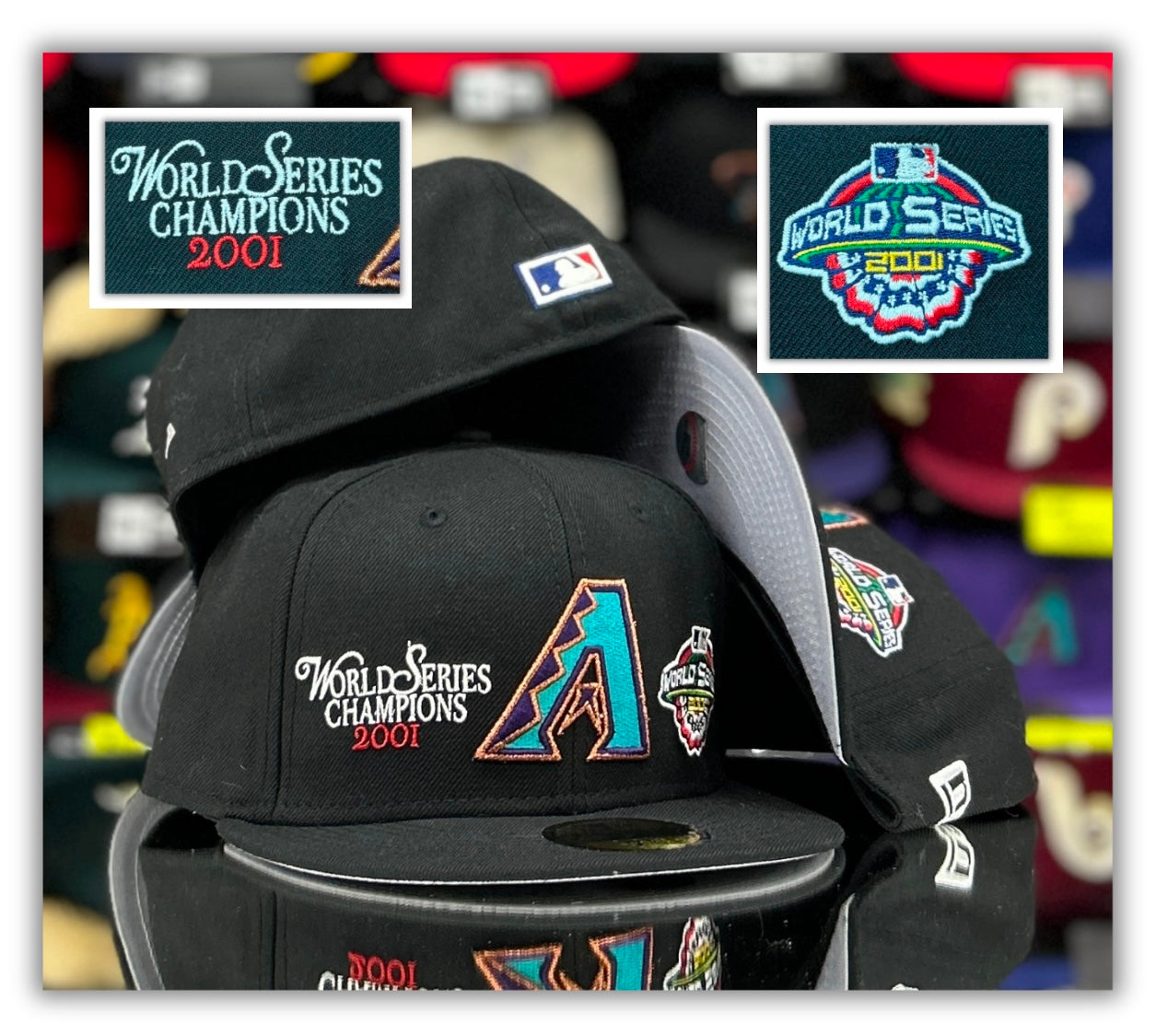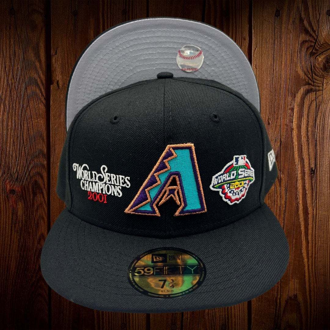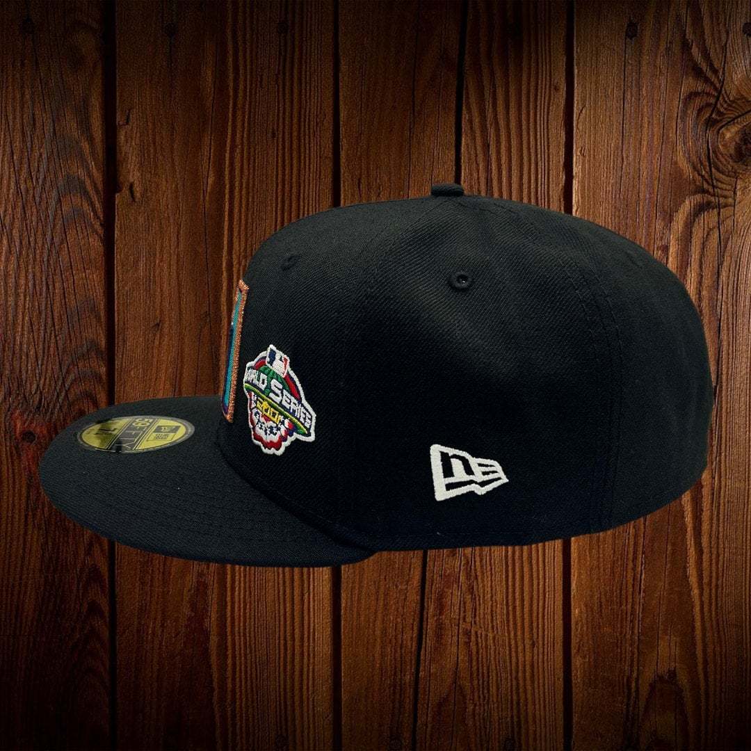 NEW ERA ARIZONA DIAMONDBACKS ALL BLACK WITH 2001 WORLD SERIES PATCHES IN THE FRONT 59FIFTY FITTED HAT THE SOUTH CAP